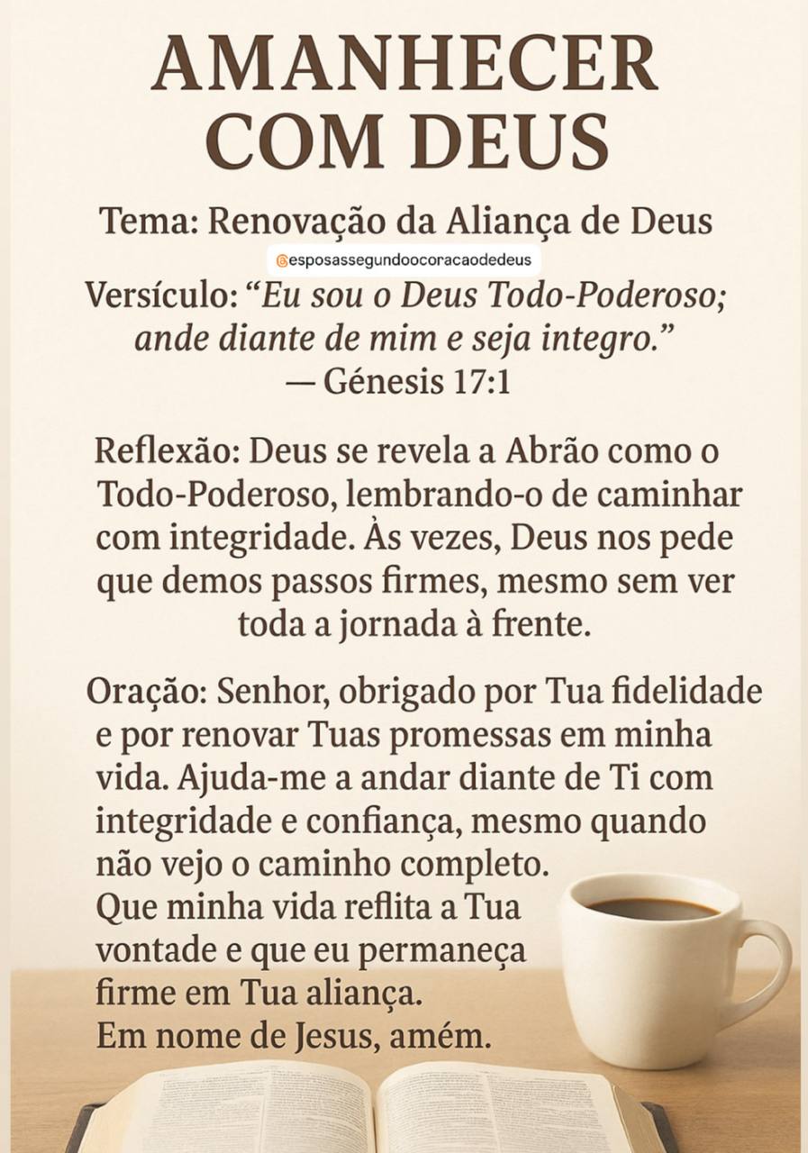 Senhor, obrigado por Tua fidelidade e por renovar Tuas promessas em minha vida. Ajuda-me a andar diante de Ti com integridade e confianΓ§a, mesmo quando nΓ£o vejo o caminho completo. Que minha vida reflita a Tua vontade e que eu permaneΓ§a firme em Tua alianΓ§a. Em nome de Jesus, amΓ©m.