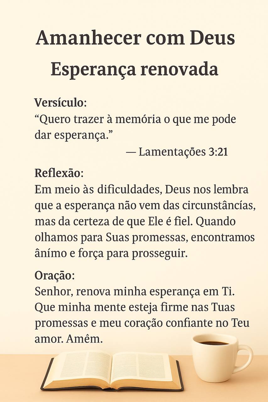 Senhor, renova minha esperança em Ti. Que minha mente esteja firme nas Tuas promessas e meu coração confiante no Teu amor. Amém.