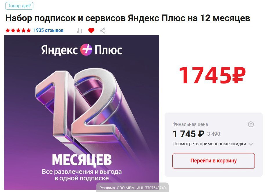 Получается 145₽/мес - скорее продляй набор подписок и сервисов Яндекс Плюс на 12 месяцев за 1745₽ в М.Видео: https://www.tg-me.com/c/1347209731/109043