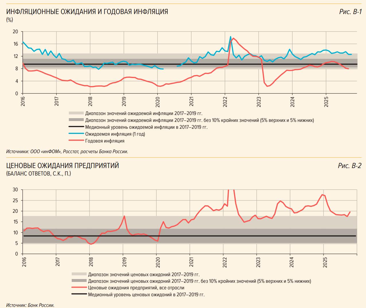 ЦБ берет за бенчмарк период 2017-2019 годов, когда инфляция устойчиво держалась около 4%, получает медиану 9,5% (диапазон 90% времени 8,4-11,2%) и признает это "нормальным" уровнем ожиданий при/для достижении цели.