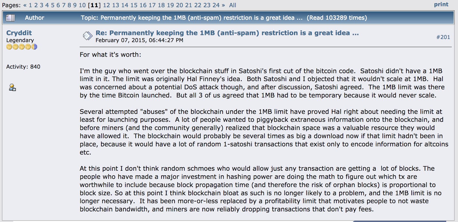 Several attempted "abuses" of the blockchain under the 1MB limit have proved Hal right about needing the limit at least for launching purposes. A lot of people wanted to piggyback extraneous information onto the blockchain, and before miners (and the community generally) realized that blockchain space was a valuable resource they would have allowed it. The blockchain would probably be several times as big a download now if that limit hadn't been in place, because it would have a lot of random 1-satoshi transactions that exist only to encode information for altcoins etc.
