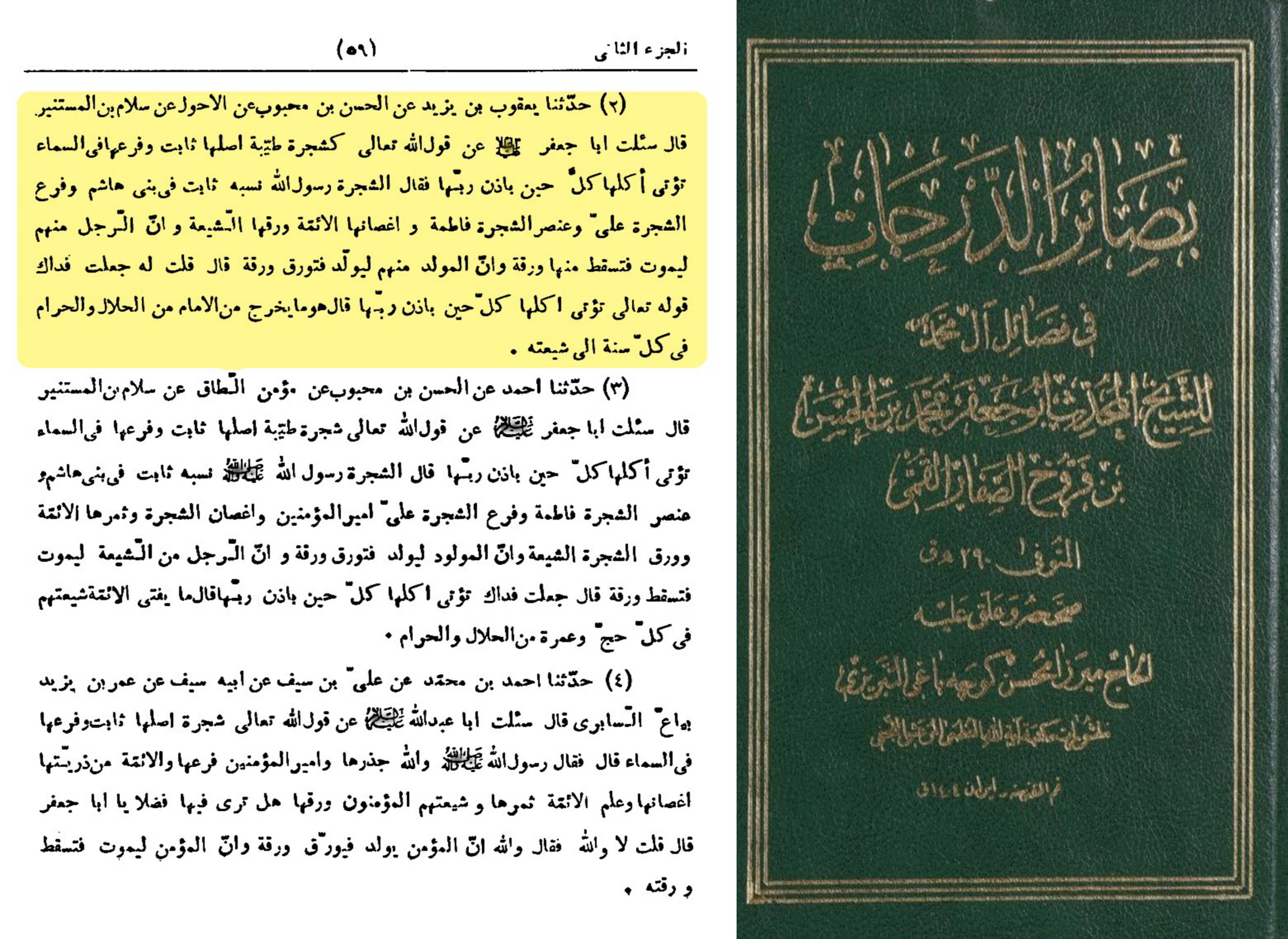 ←بر اساس روایات فراوان، مقصود از «شجره طیّبه» در آیه شریفه حضرت خاتم الانبیاء (صلی الله علیه و آله) و شاخه های آن یعنی اوصیای معصوم ایشان (علیهم السلام) هستند.←همچنین میوه های مستمرّ این درخت، به علومی که از آنان خارج میشود تفسیر شده است.(نمونه: بصائر الدرجات/۵۹ - دانلود اسکن)