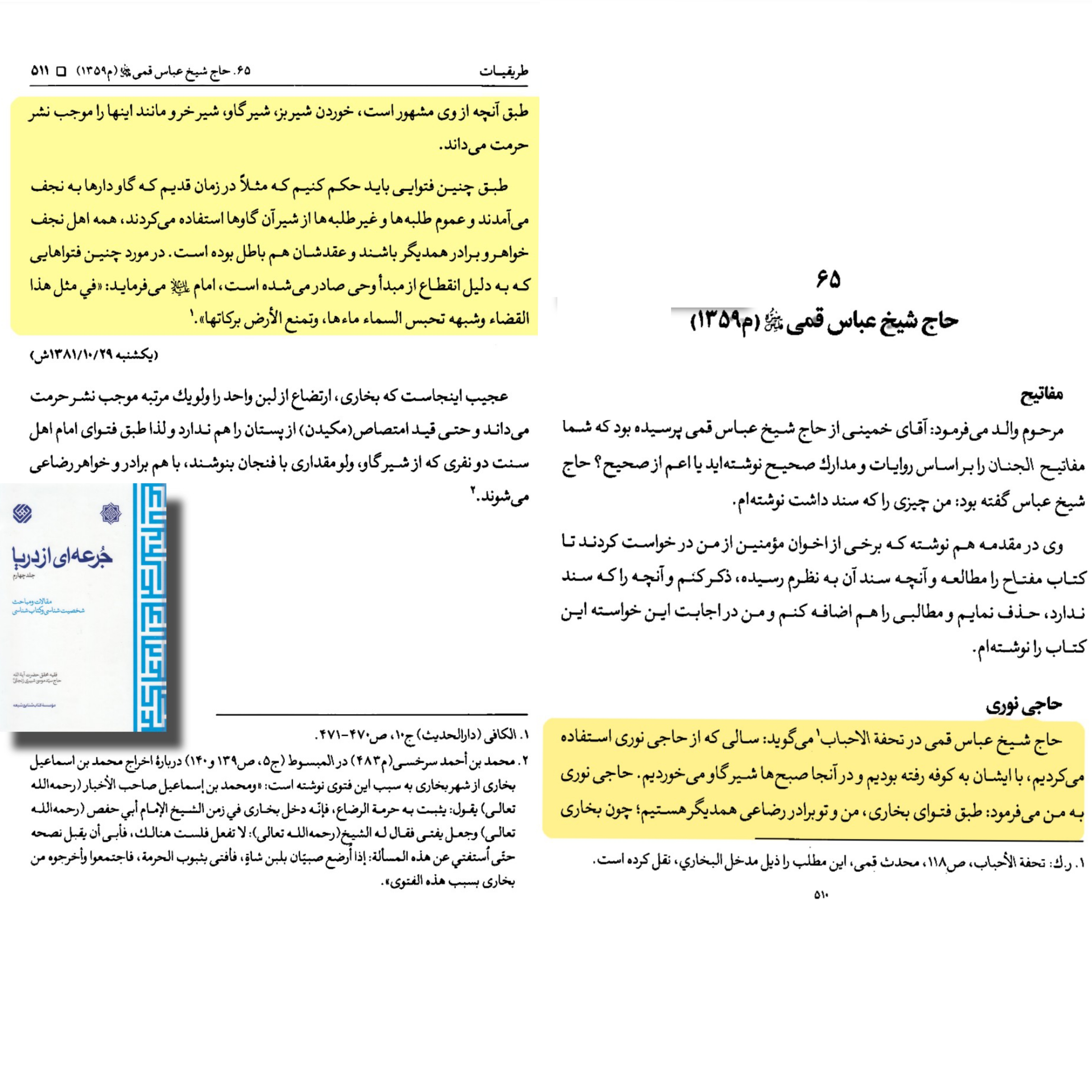 ● حاج شیخ عبّاس قمی در تحفة الاحباب میگوید: سالی که از حاجی نوری استفاده میکردیم، با ایشان به کوفه رفته بودیم و در آنجا صبحها شیر گاو میخوردیم. حاجی نوری بـه مـن میفرمود: طبق فـتـوای بخاری، من و تو برادر رضاعی همدیگر هستیم؛ چون بخاری طبق آنچه از وی مشهور است، خوردن شیر بز، شیر گاو، شیر خر و مانند اینها را موجب نشر حرمت میداند.