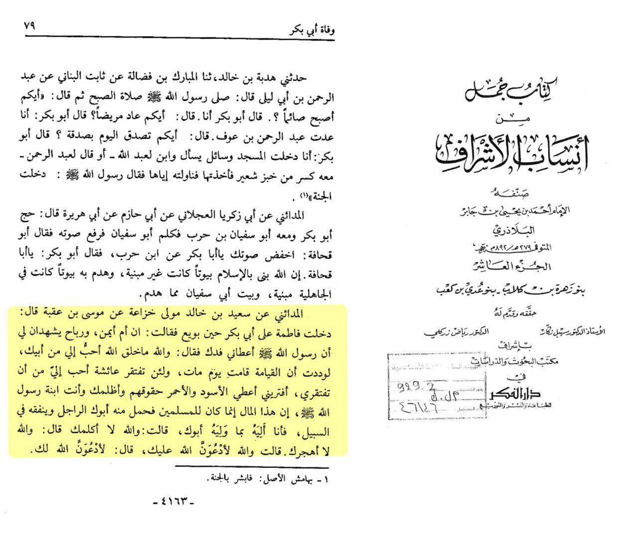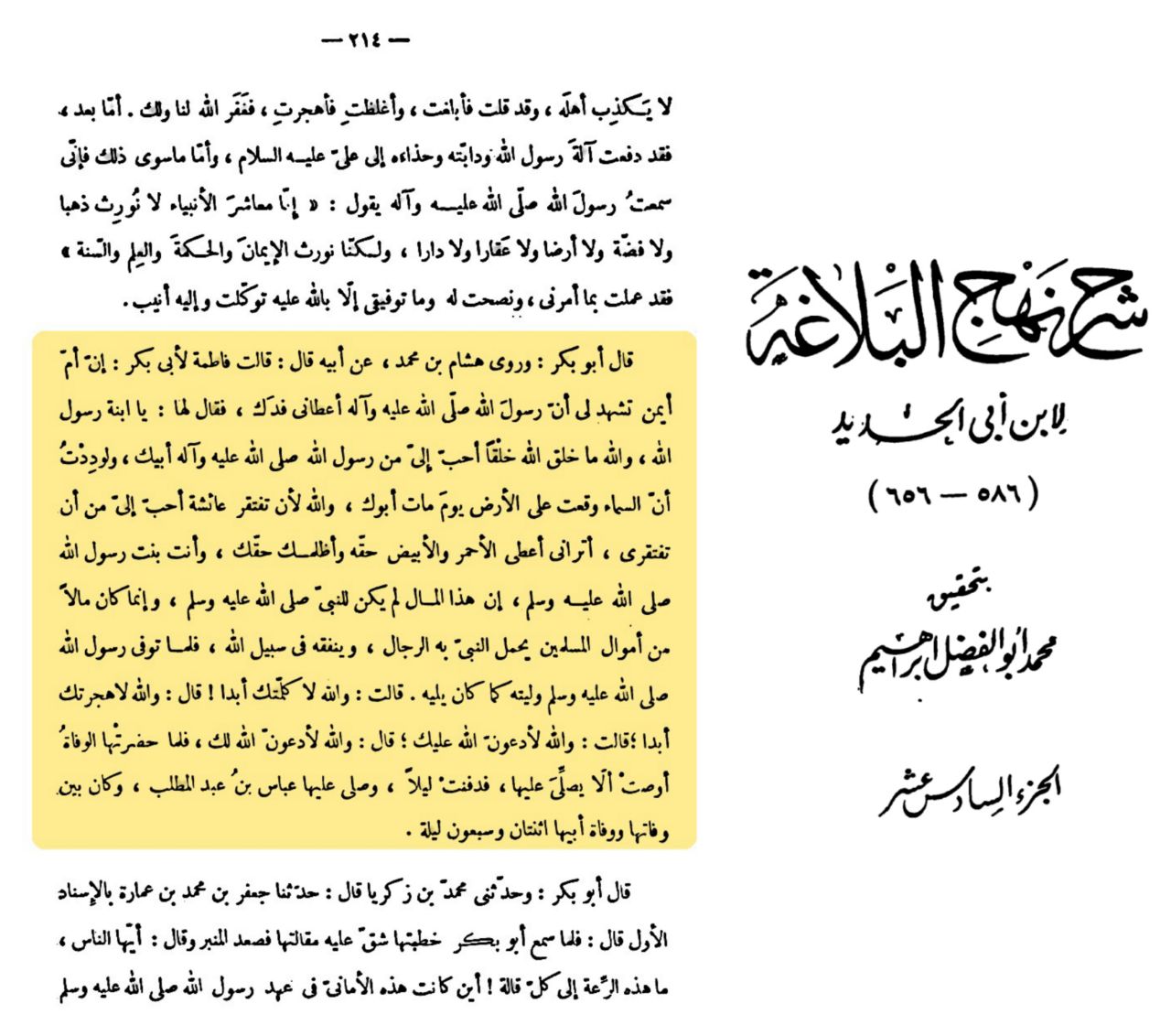 ▫️المدائني عن سعيد بن خالد مولى خزاعة عن موسى بن عقبة قال: دخلت فاطمة على أبي بكر حين بويع فقالت: ان أم أيمن، ورباح يشهدان لي أن رسول الله صلى الله عليه وسلم أعطاني فدك فقال: والله ما خلق الله أحبّ إلي من أبيك، لوددت أن القيامة قامت يوم مات، ولئن تفتقر عائشة أحب إليّ من أن تفتقري، أفتريني أعطي الأسود والأحمر حقوقهم وأظلمك وأنت ابنة رسول الله صلى الله عليه وسلم، إن هذا المال إنما كان للمسلمين فحمل منه أبوك الراجل وينفقه في السبيل، فأنا أليه بما وليه أبوك، قالت: والله لا أكلمك قال: والله لا أهجرك. قالت