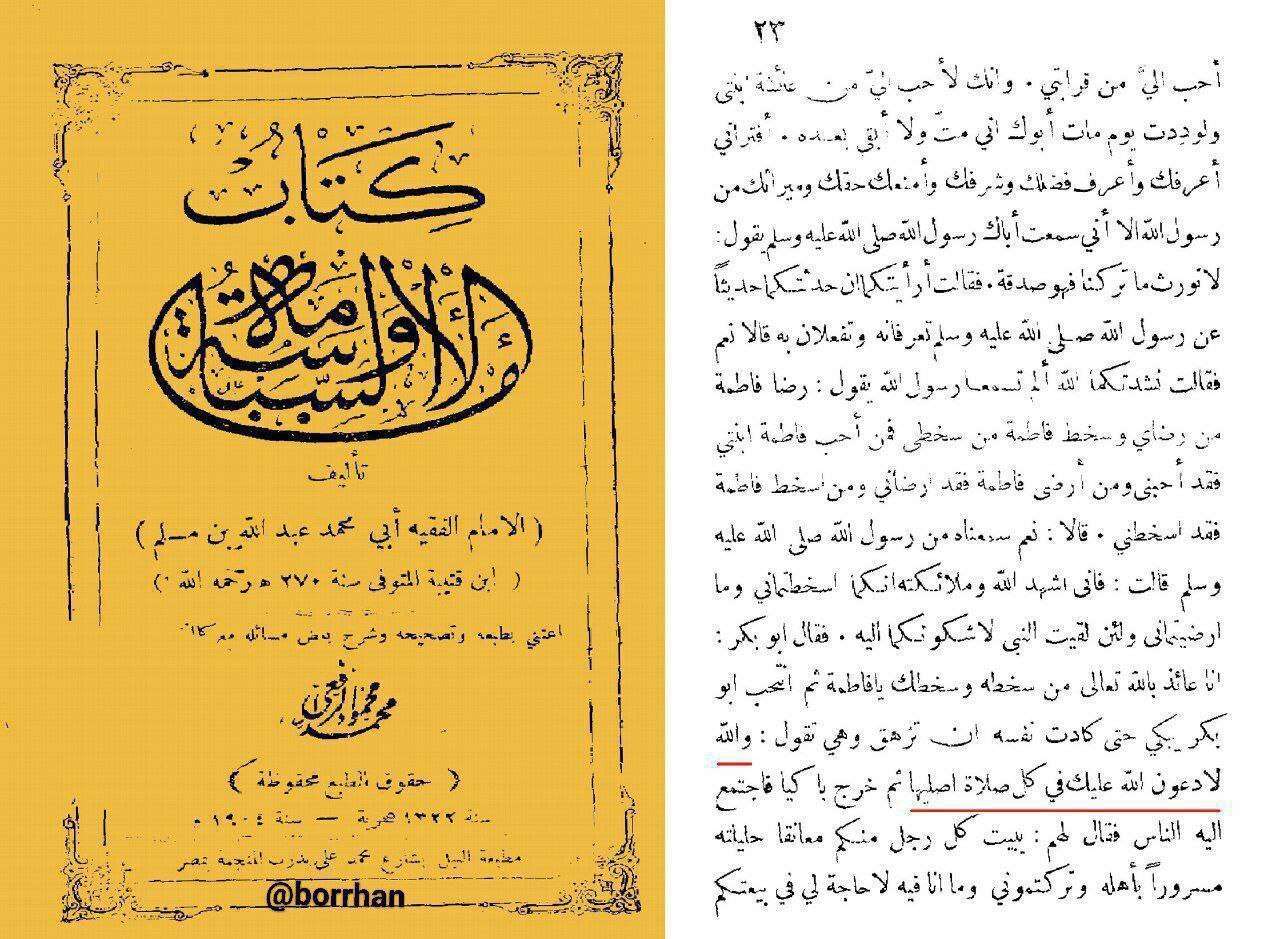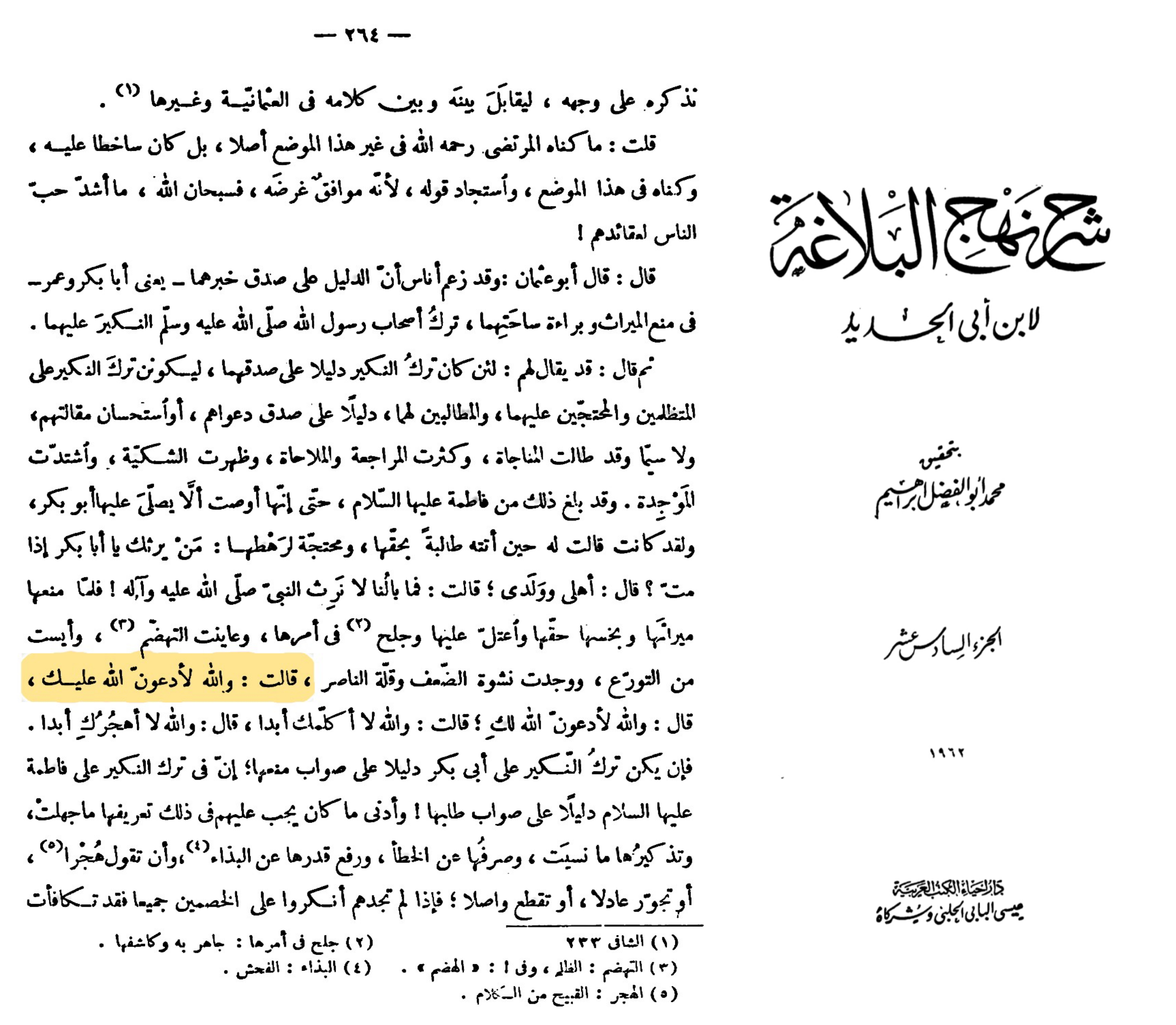 ▫️در نقلی دیگر در الإمامة والسیاسة نیز گفته شده حضرت صدیقهٔ طاهره سلام الله علیها فرموده که ابوبکر را در هر نمازش نفرین خواهد کرد: