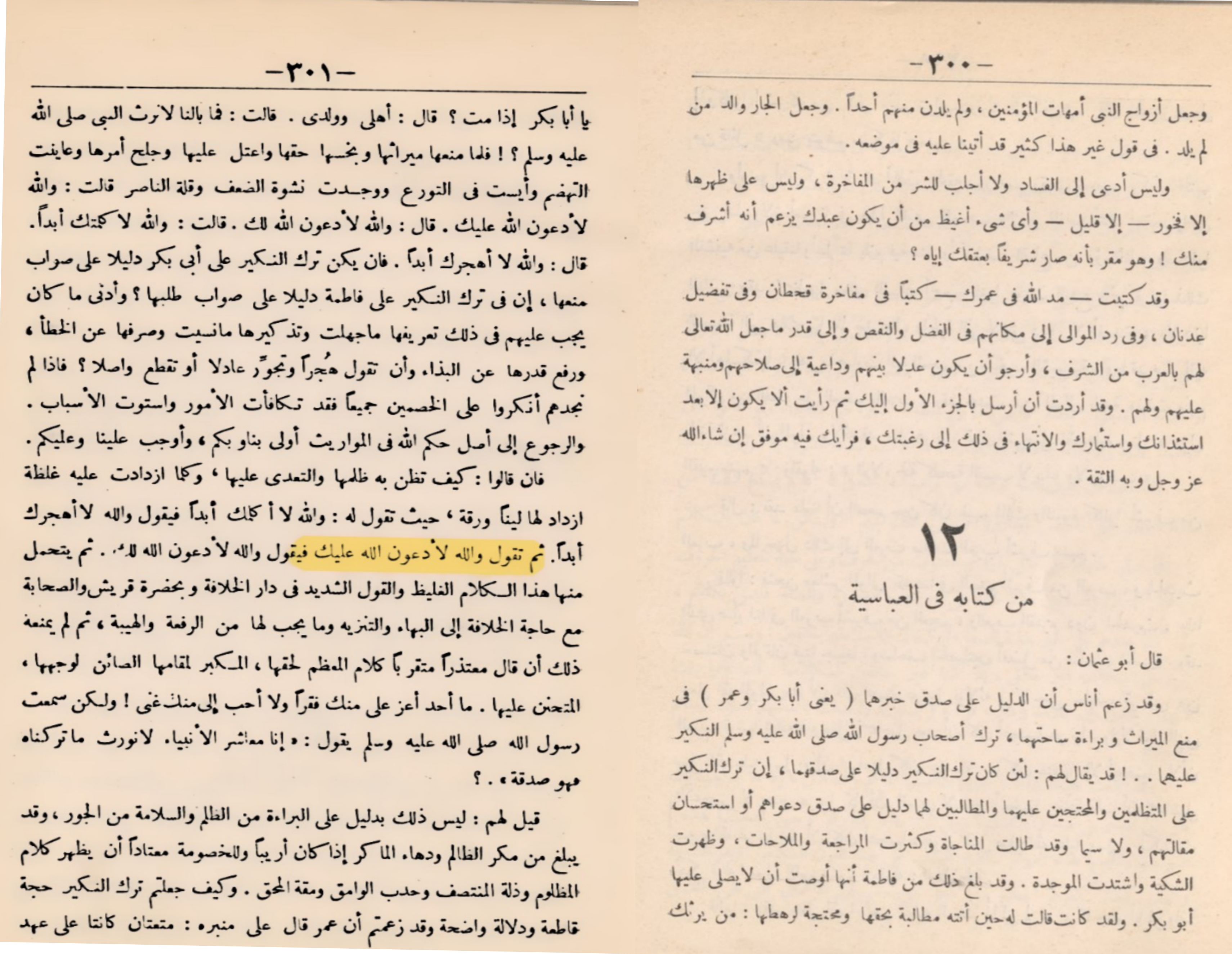 ▫️ابوعثمان جاحظ (د. 255ق) نیز در رسالهٔ عباسیه اشاره کرده به اینکه حضرت فاطمه (س) به ابوبکر گفته که او را نفرین خواهد فرمود: