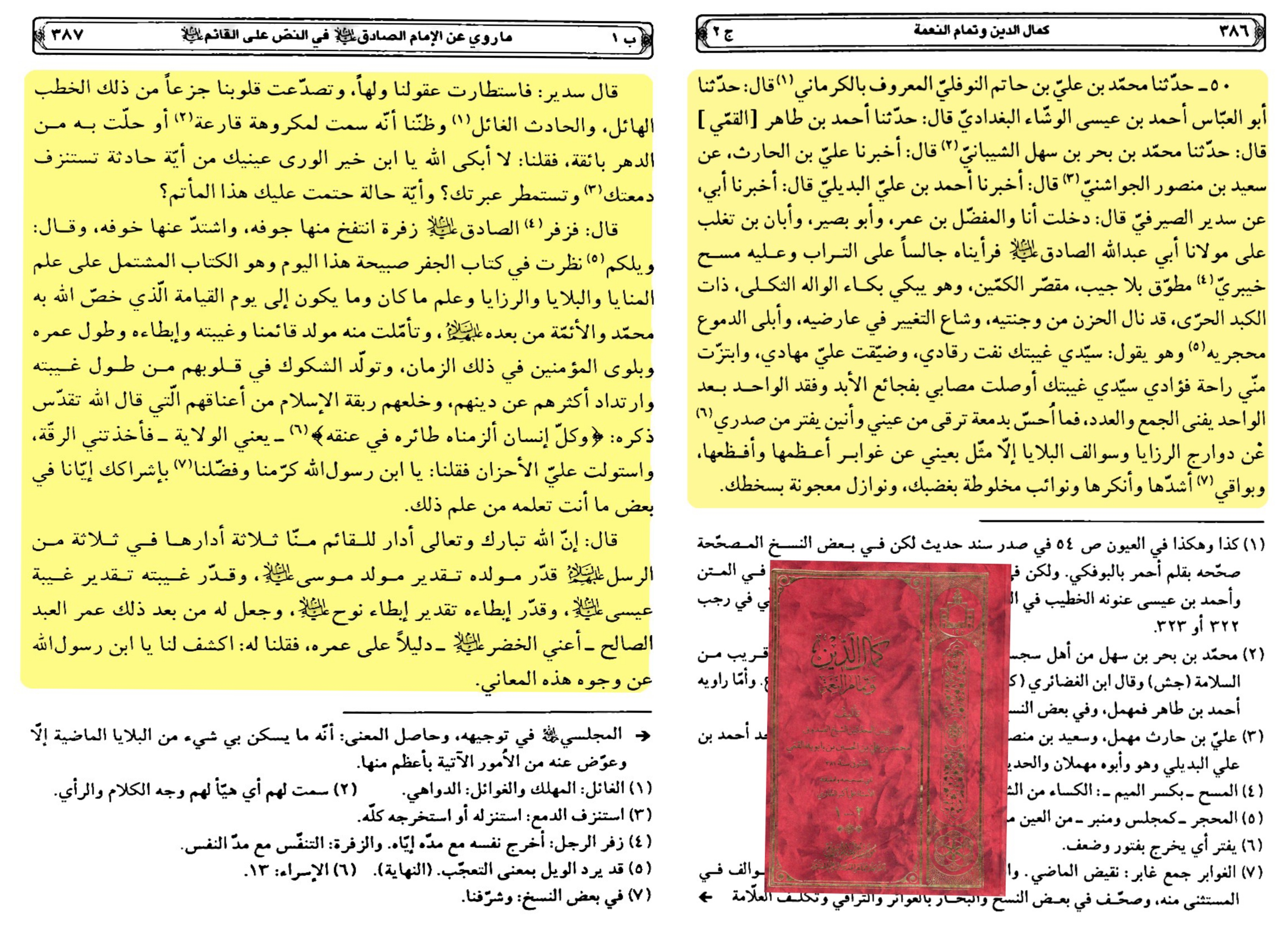 🔸نَظَرْتُ فِي كِتَابِ الْجَفْرِ صَبِيحَةَ هَذَا الْيَوْمِ وَ هُوَ الْكِتَابُ الْمُشْتَمِلُ عَلَى عِلْمِ الْمَنَايَا وَالْبَلَايَا وَالرَّزَايَا وَعِلْمِ مَا كَانَ وَ مَا يَكُونُ إِلَى يَوْمِ الْقِيَامَةِ الَّذِي خَصَّ اللَّهُ بِهِ مُحَمَّداً وَ الْأَئِمَّةَ مِنْ بَعْدِهِ ع وَ تَأَمَّلْتُ مِنْهُ مَوْلِدَ قَائِمِنَا وَ غِيبَتَهُ وَ إِبْطَاءَهُ وَ طُولَ عُمُرِهِ وَ بَلْوَى الْمُؤْمِنِينَ فِي ذَلِكَ الزَّمَانِ وَ تَوَلُّدَ الشُّكُوكِ فِي قُلُوبِهِمْ مِنْ طُولِ غَيْبَتِهِ وَ ارْتِدَادَ أَكْثَرِهِمْ عَنْ دِينِهِمْ وَ خَلْعَهُمْ رِبْقَةَ الْإِسْلَامِ مِنْ أَعْنَاقِهِمُ الَّتِي قَالَ اللَّهُ تَقَدَّسَ ذِكْرُهُ وَ كُلَّ إِنسانٍ أَلْزَمْناهُ طائِرَهُ فِي عُنُقِهِ يَعْنِي الْوَلَايَةَ فَأَخَذَتْنِي الرِّقَّةُ وَ اسْتَوْلَتْ عَلَيَّ الْأَحْزَانُ(۳)