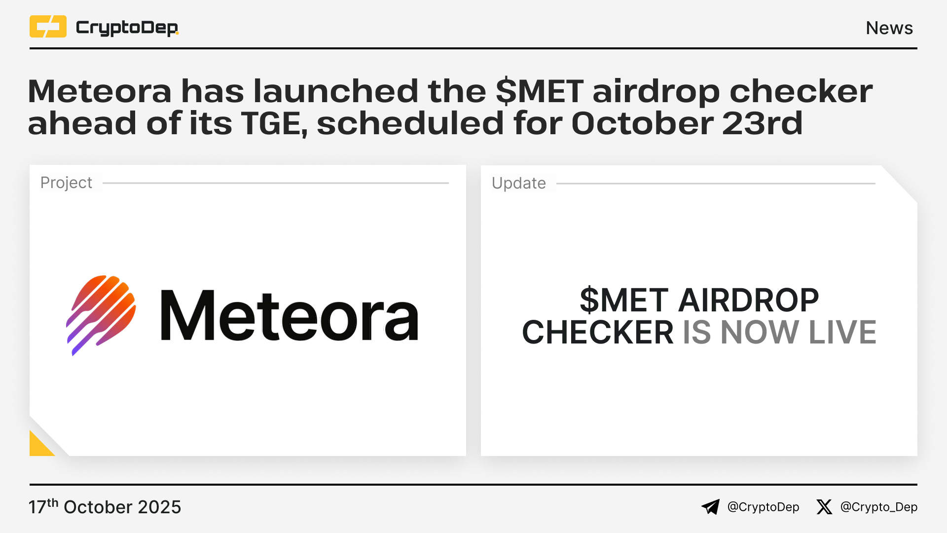 ​​Meteora has launched the $MET airdrop checker ahead of its TGE, scheduled for October 23rd