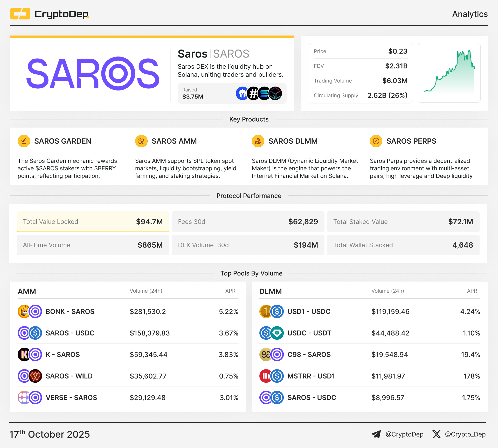 Saros DEX is Solana’s liquidity hub, connecting traders, LPs, and builders in one ecosystem. Backed by Solana Ventures, Hashed, and The Spartan Group, the protocol holds over $94M TVL.