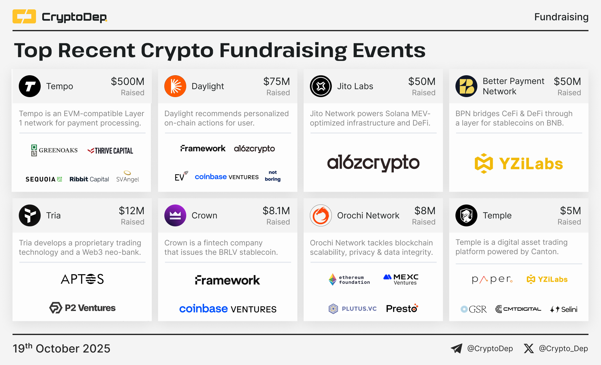 Presenting a list of some recent crypto fundraising rounds, backed by well-known investors such as a16z, YZi Labs, Coinbase Ventures, Sequoia, Framework, Ethereum Foundation, P2 Ventures, GSR, Escape Velocity, MEXC Ventures, and others. Let's take a look!