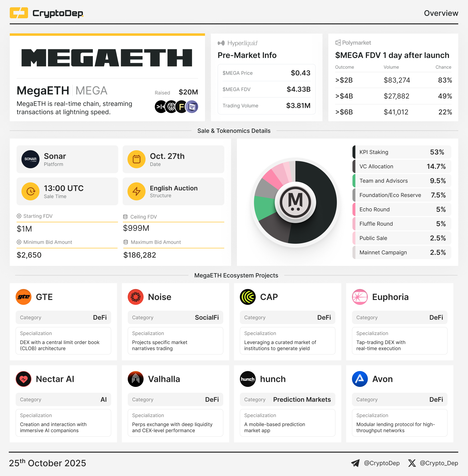 MegaETH, backed by Vitalik Buterin, is one of the most anticipated L2s. $MEGA sale begins October 27 on Sonar, with the pre-market currently trading around $0.43 ($4.3B FDV).