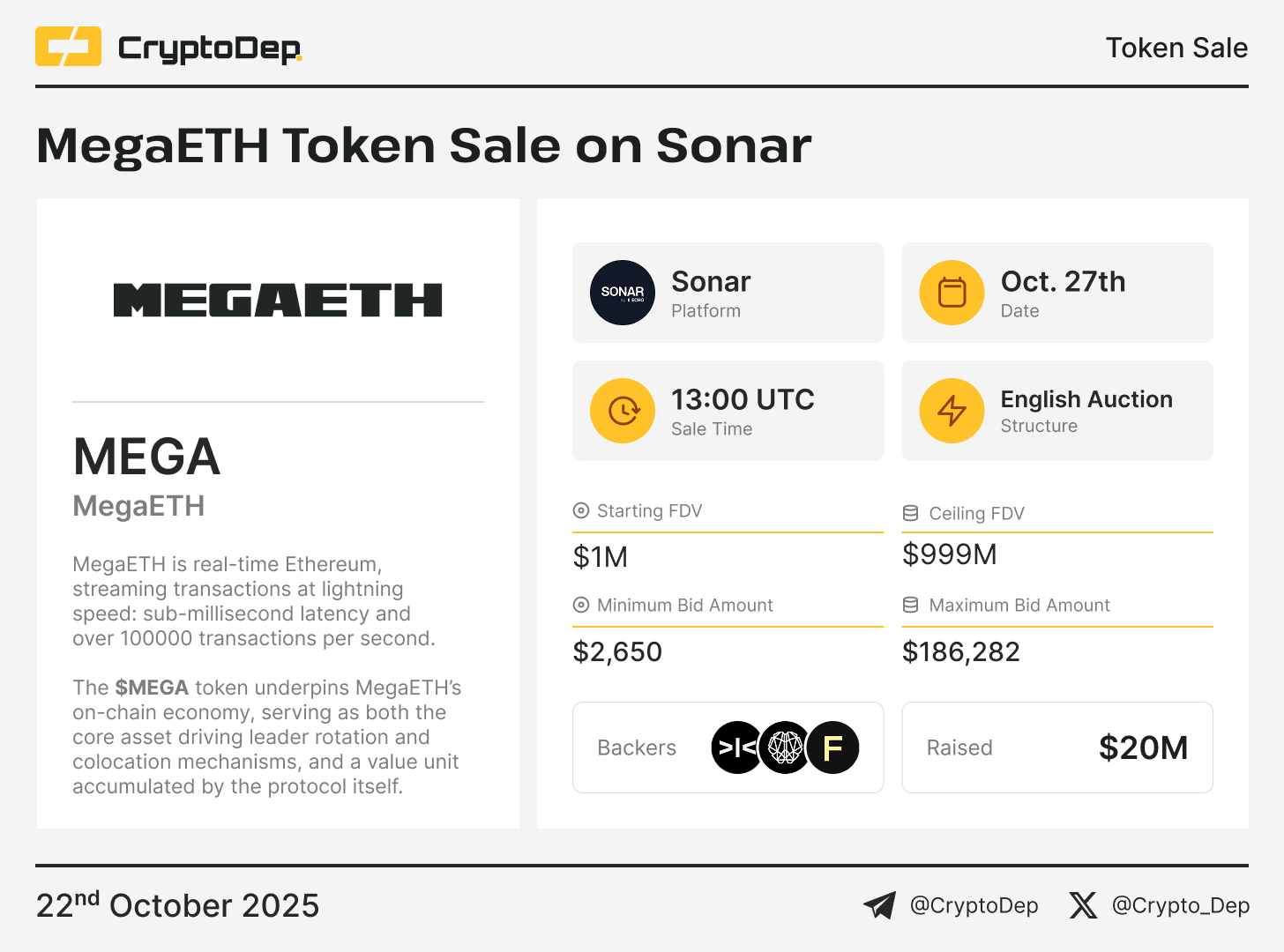 The open bidding period for the sale will start on October 27th, at 13:00 UTC and will run for 72 hours. Participants commit $USDT on Ethereum mainnet to secure $MEGA allocations, with the sale structured as an English auction capped at $0.0999 per token ($999M FDV). U.S. accredited investors face a mandatory 1-year lockup with a 10% discount, while non-U.S. participants can opt in for the same discount voluntarily.