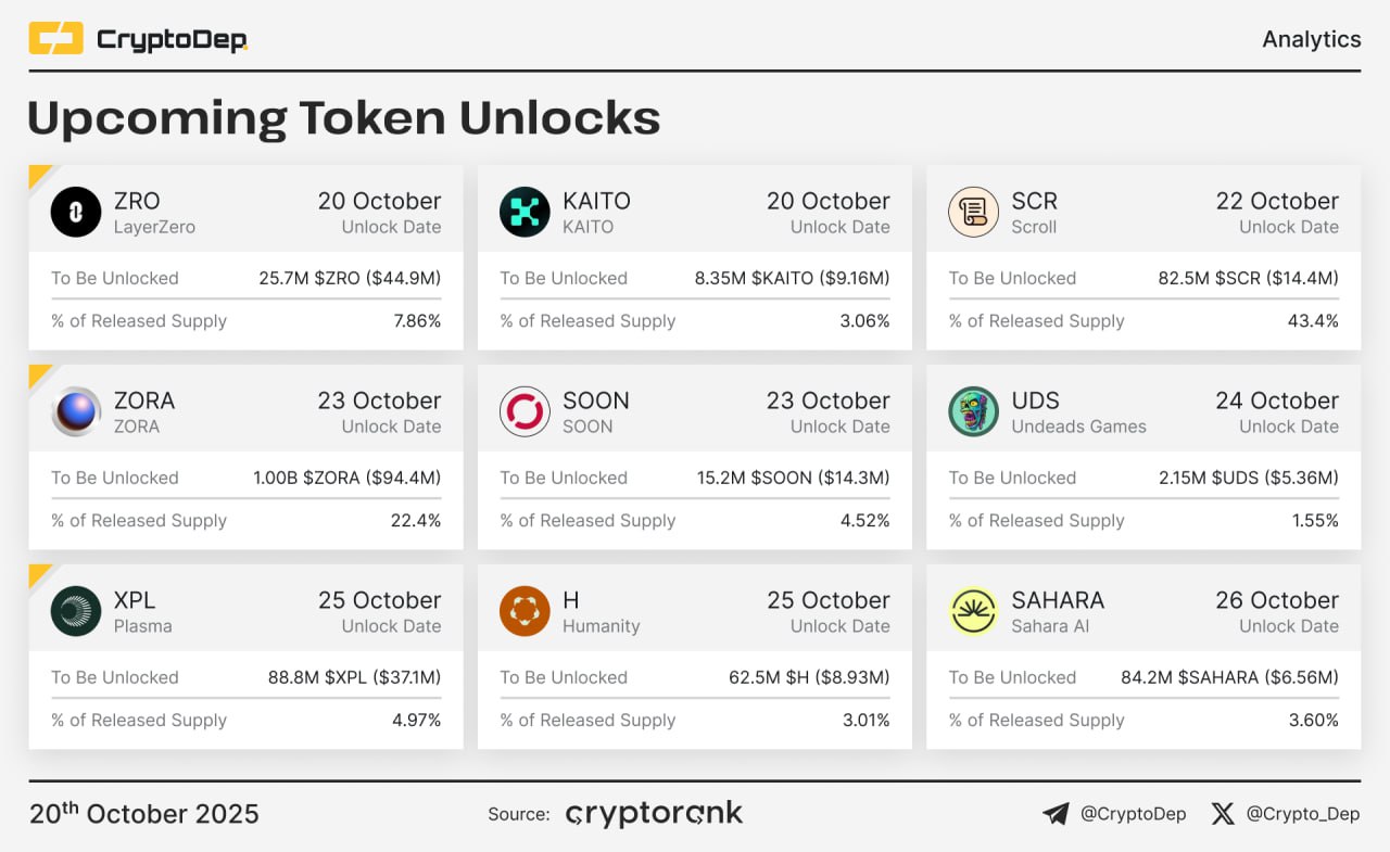 During this week, $ZORA, $ZRO, $XPL, $ARB, and $SCR will have the biggest unlocks.