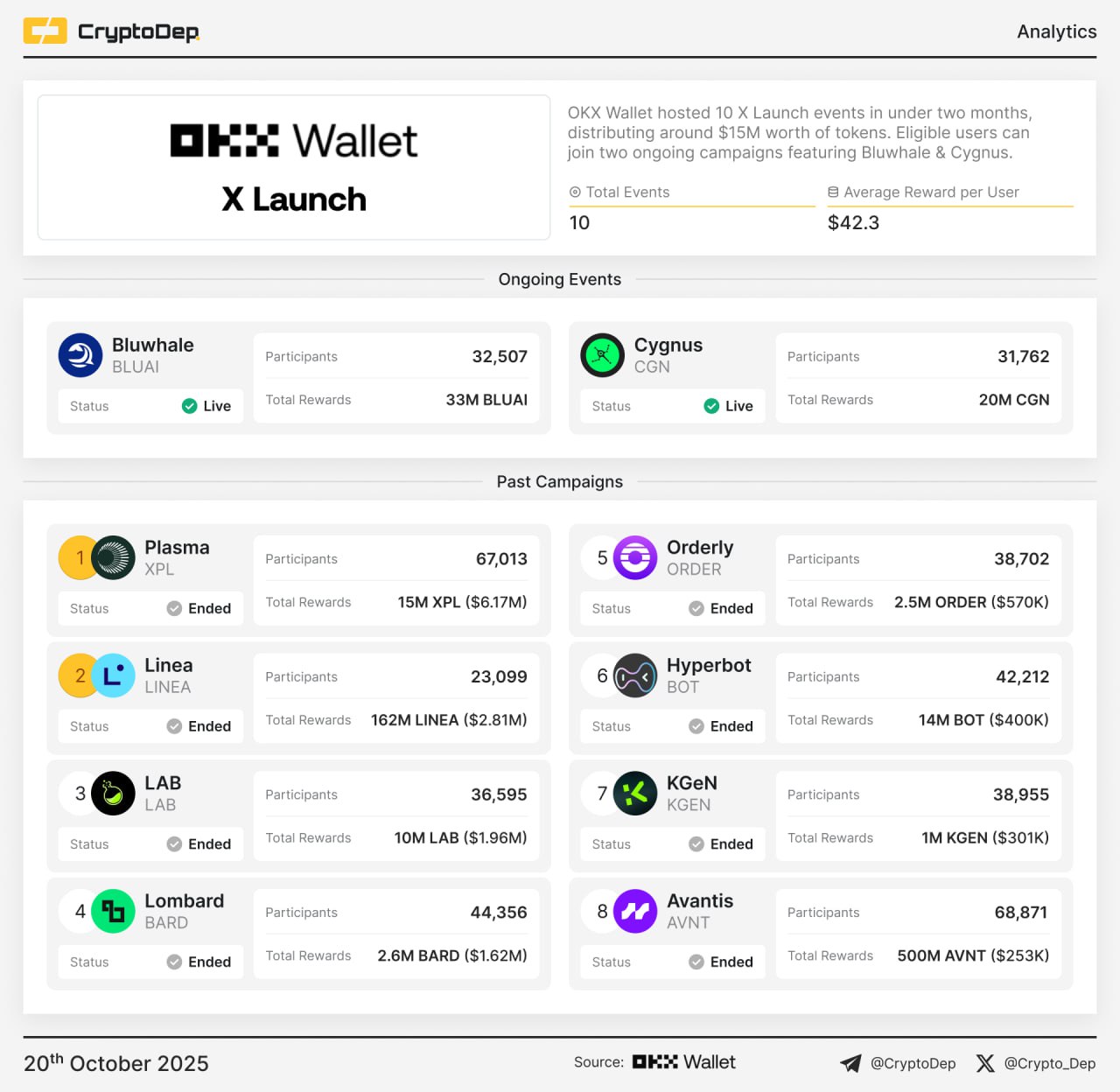 OKX Wallet hosted 10 X Launch events in under two months, distributing around $15M worth of tokens. Eligible users can join two ongoing campaigns featuring Bluwhale & Cygnus.