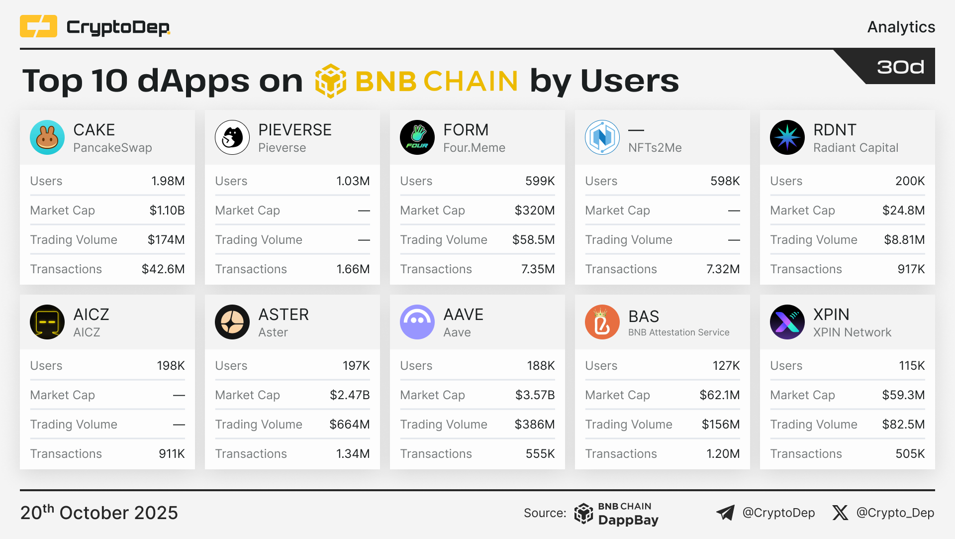 Amid the ongoing surge in on-chain activity, cumulative DEX volume on BNB Chain has surpassed $2T. Leading dApps by user count include PancakeSwap, Pieverse, Four.Meme, and others.