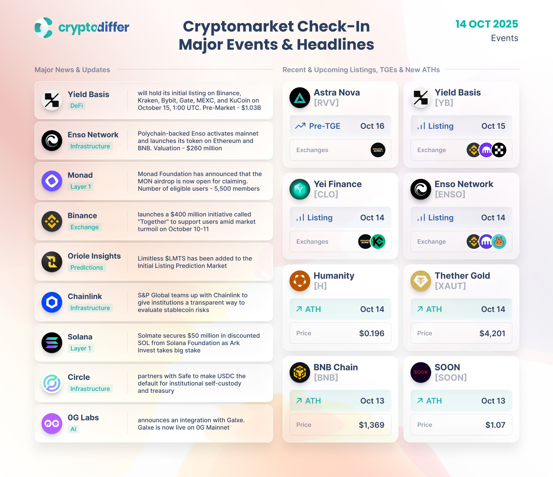 This snapshot covers key updates, including Yield Basis Initial Listing, Enso Mainnet, Monad Airdrop Claim Page, Limitless Predictions on Oriole Insights, alongside news from other notable projects. Humanity Protocol, Tether Gold, BNB, and Soon, hit new all-time highs.