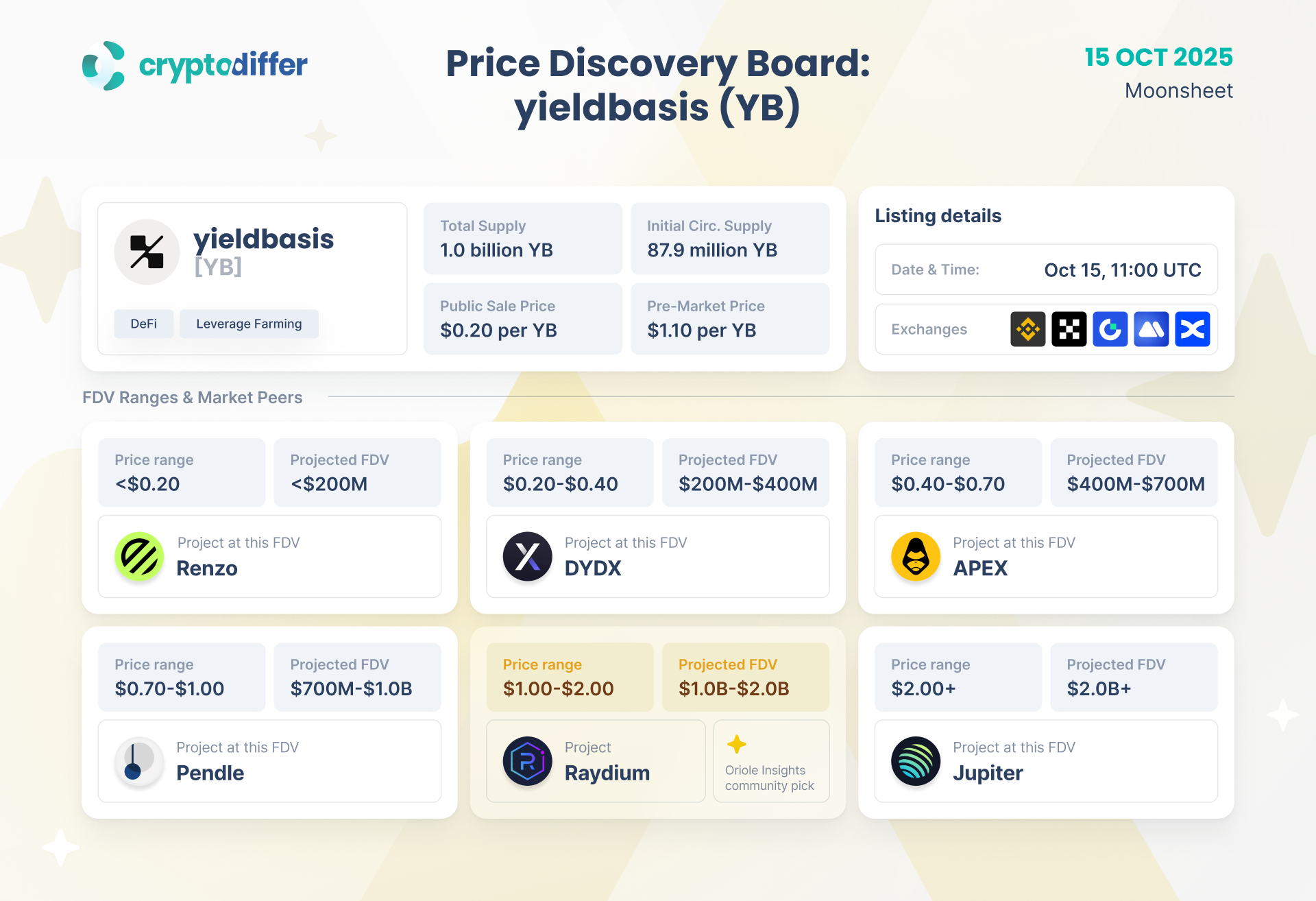 YB set to launch on October 15th at 11:00 UTC, backed by $7.5M in public funding. This board benchmarks potential FDV scenarios using comparable DeFi projects like DYDX, APEX and Raydium.