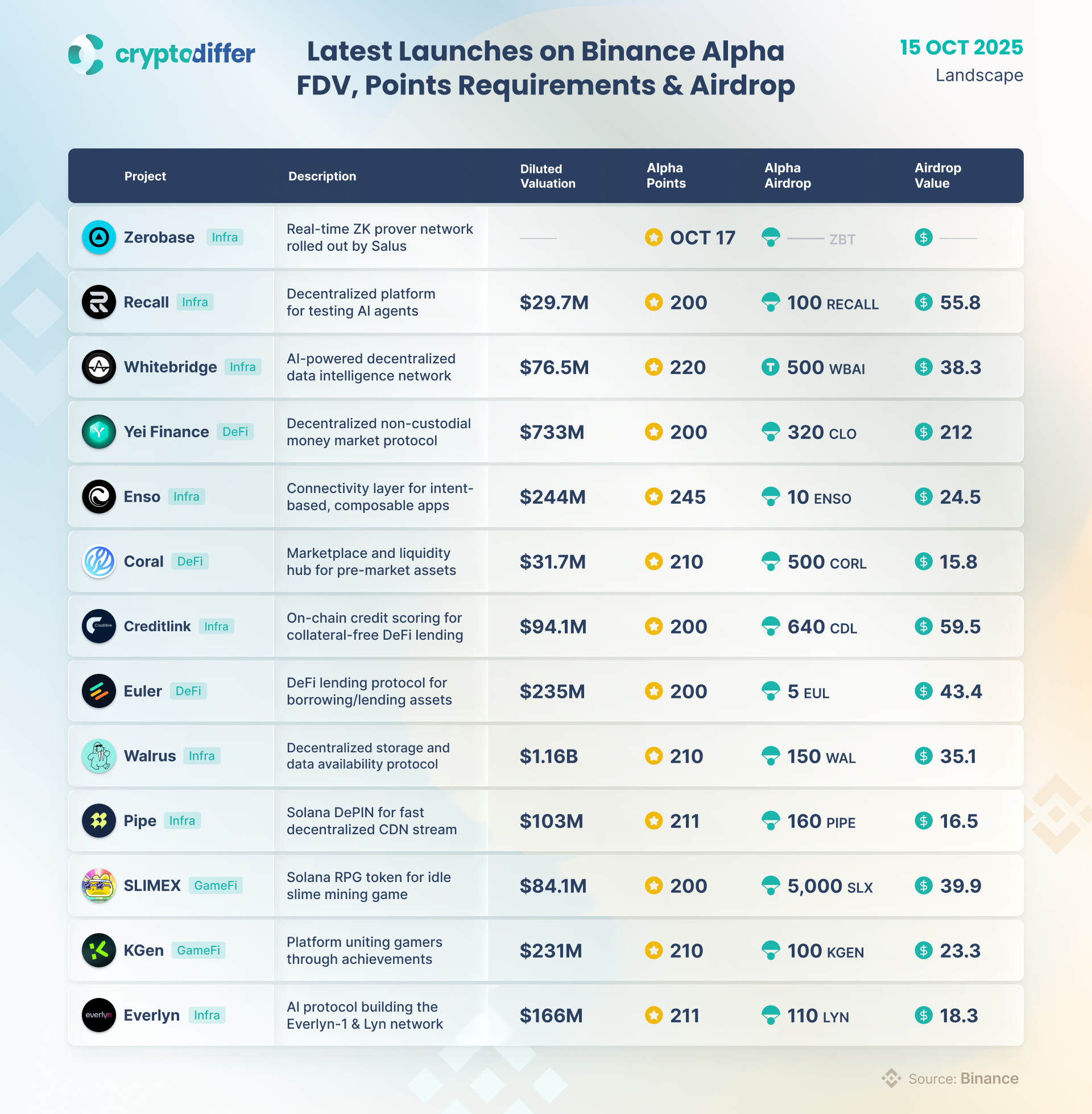 Walrus, Yei Finance, and Enso ranked among the largest projects by FDV, with Yei Finance distributing the highest airdrop and seeing a 450% price surge since its initial listing. Slimex and Coral Finance closed out the top airdrop projects, delivering low returns across the latest airdrops. The next Alpha Airdrop β Zerobase, Oct 17.