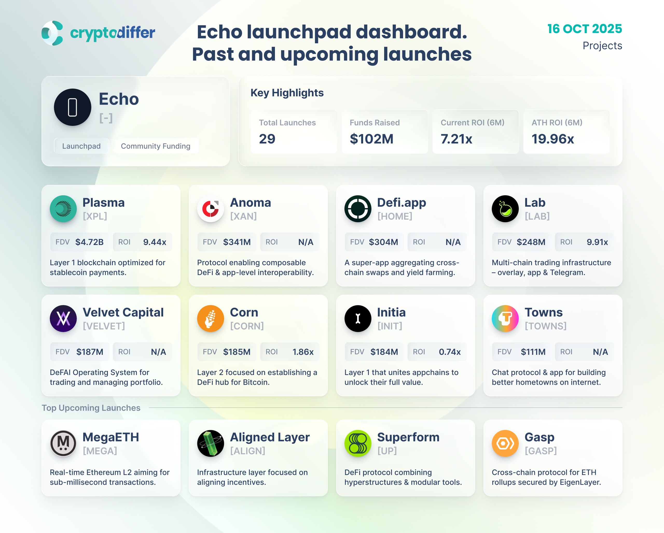 Echoβs launchpad keeps humming: 29 launches, $102M raised, with a current ROI of ~7.2x. This dashboard tracks past hits like Plasma, Anoma, Defi app, Velvet, Corn, Initia, Townsβand highlights upcoming bets: MegaETH, Aligned Layer, Superform, Gasp.