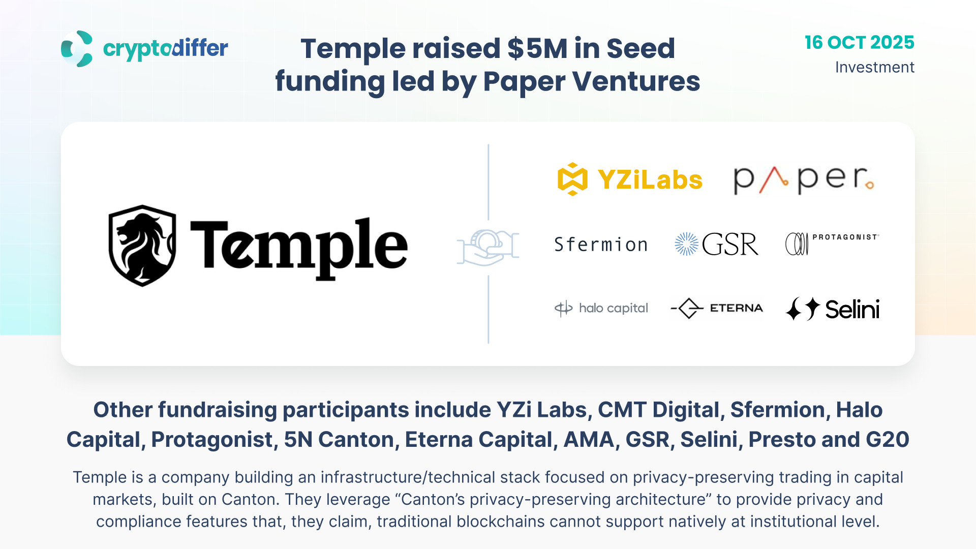 Other fundraising participants include YZi Labs, CMT Digital, Sfermion, Halo Capital, Protagonist, Eterna and others. Temple is a company building an infrastructure/technical stack focused on privacy-preserving trading in capital markets, built on Canton.