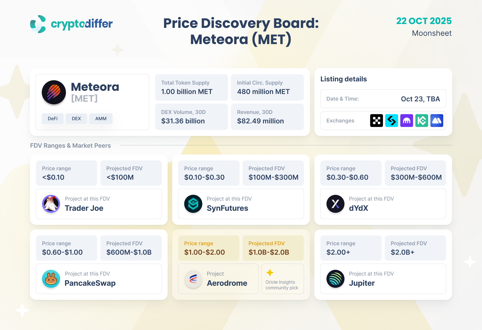 One of the biggest DEXs on Solana, Meteora (MET) set to launch its token tomorrow. This board benchmarks potential FDV scenarios using comparable DEXs like Jupiter, Aerodrome and PancakeSwap.