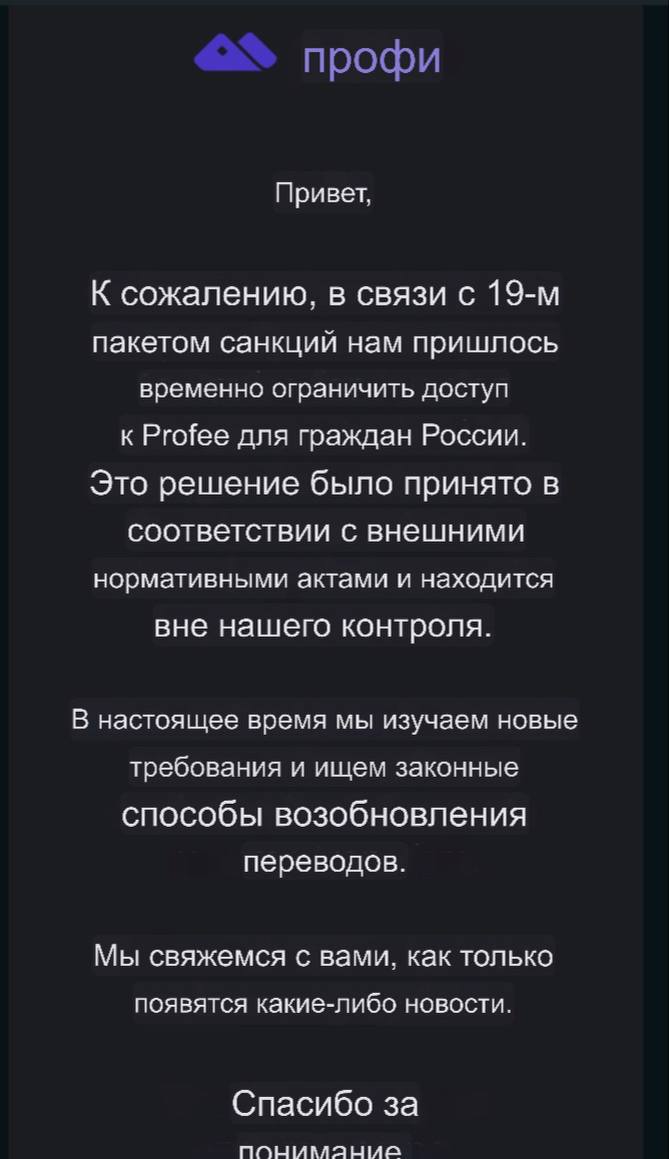Из-за 19-го пакета санкций ЕС сервис, при помощи которого можно было перевести деньги с европейской банковской карты на российскую, разослал россиянам сообщения (на скриншоте). Причем, коснулось ограничение россиян с ВНЖ Евросоюза. Для них, скорее всего, только на время. Для остальных надолго.