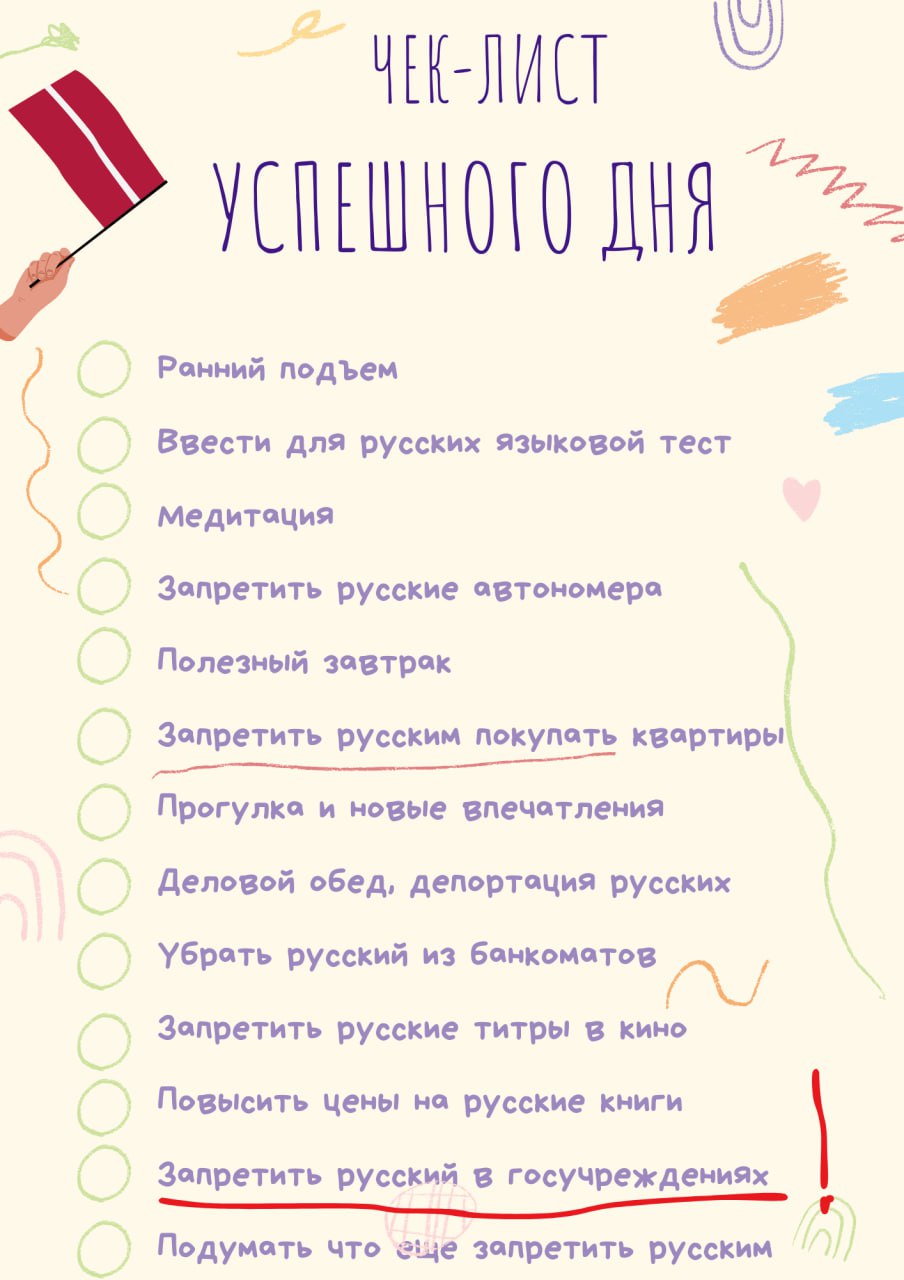 Самое время обновить чек-лист успешного дня латвийского политика. Страшно даже представить, как скучно будет в стране, когда там, наконец, запретят все что хоть как-то связано с русским языком и культурой!