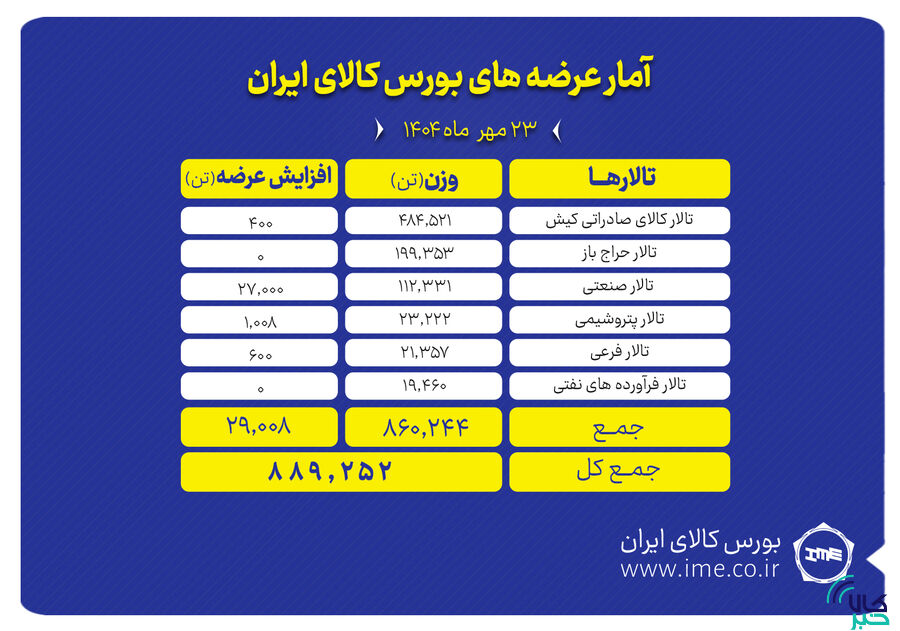 🔹تالارهای بورس کالای ایران امروز چهارشنبه ۲۳ شهریور ماه میزبان عرضه ۸۸۹ هزار و ۲۵۲ تن انواع محصول است. بیشترین عرضه امروز در تالار صادراتی است.