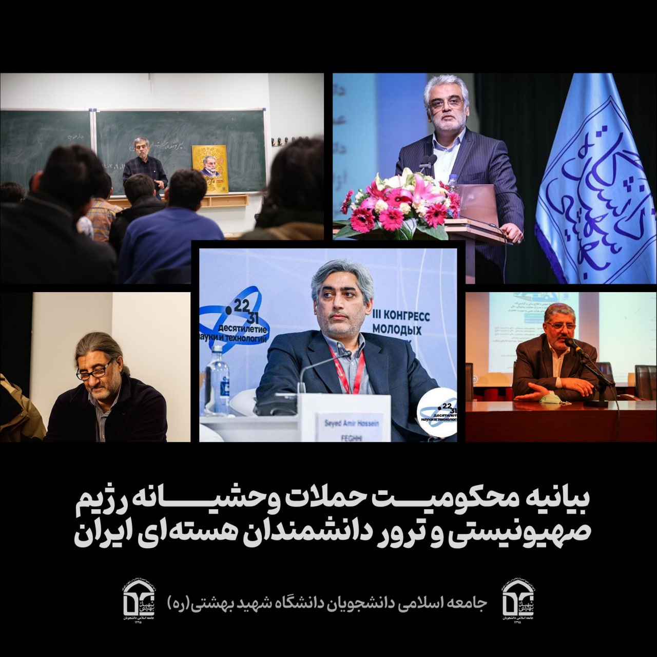 ▪️جامعه اسلامی دانشجویان دانشگاه شهید بهشتی (ره) با الهام از روحیهی انقلابی و جهادگرانهی اساتید شهید خود و با تکیه بر ایمان استوار به آرمانهای اسلامی و هدایتهای حکیمانهی مقام معظم رهبری، خواستار انتقامی سخت و فراموشنشدنی از عاملان جنایتهای اخیر است.