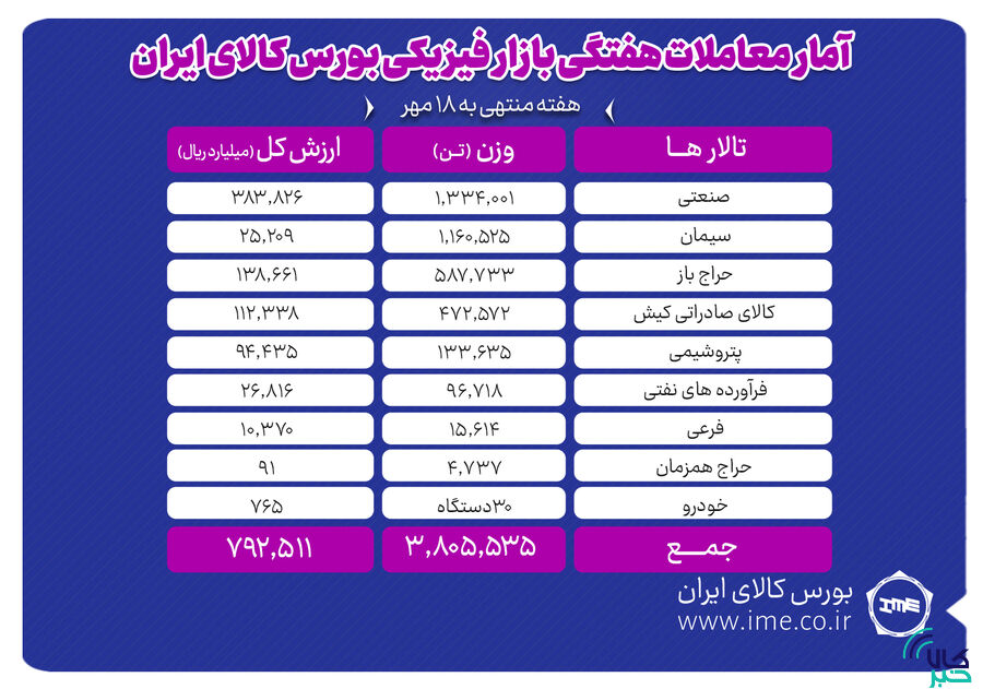 در هفته منتهی به ۱۸ مهر ماه ۳ میلیون و ۸۰۵ هزار و ۵۳۵ تن انواع کالا به ارزش ۷۹۲.۵ هزار میلیارد ریال در بازار فیزیکی بورس کالا دادوستد شد.