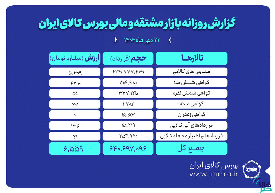 🔹روز گذشته در بازار مشتقه و مالی بورس کالای ایران ۶۴۰ میلیون و ۶۹۷ هزار و ۹۶ قرارداد به ارزش ۶ هزار و ۵۵۹ میلیارد تومان منعقد شد.