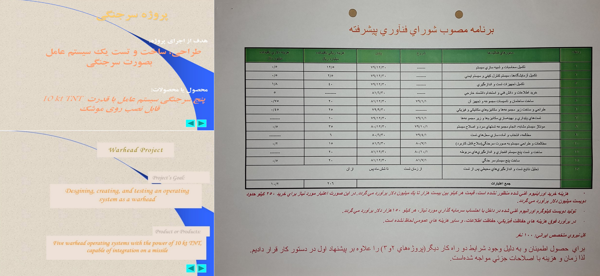 👈 طبق اسناد ادعایی به سرقت رفته در ۱۱ بهمن ۱۳۹۶ در زمان دولت روحانی، از شورآباد کهریزک، توسط رژِیم صهیونیستی، شورایعالی فناوریهای پیشرفته، به ریاست محمد خاتمی، رئیسجمهور وقت ایران در سال ۱۳۷۸، برنامهای برای طراحی و ساخت پنج سرجنگی با کلاهک هستهای قابل نصب بر موشکهای بالستیک تصویب میکند؛