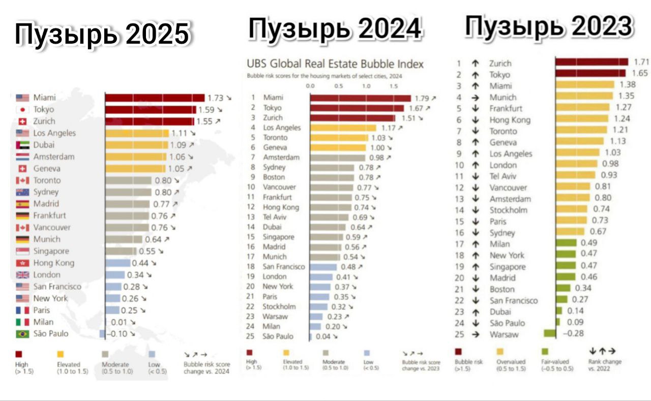 ▪️ Наибольший риск «пузыря» — в Майами, Токио и Цюрихе.