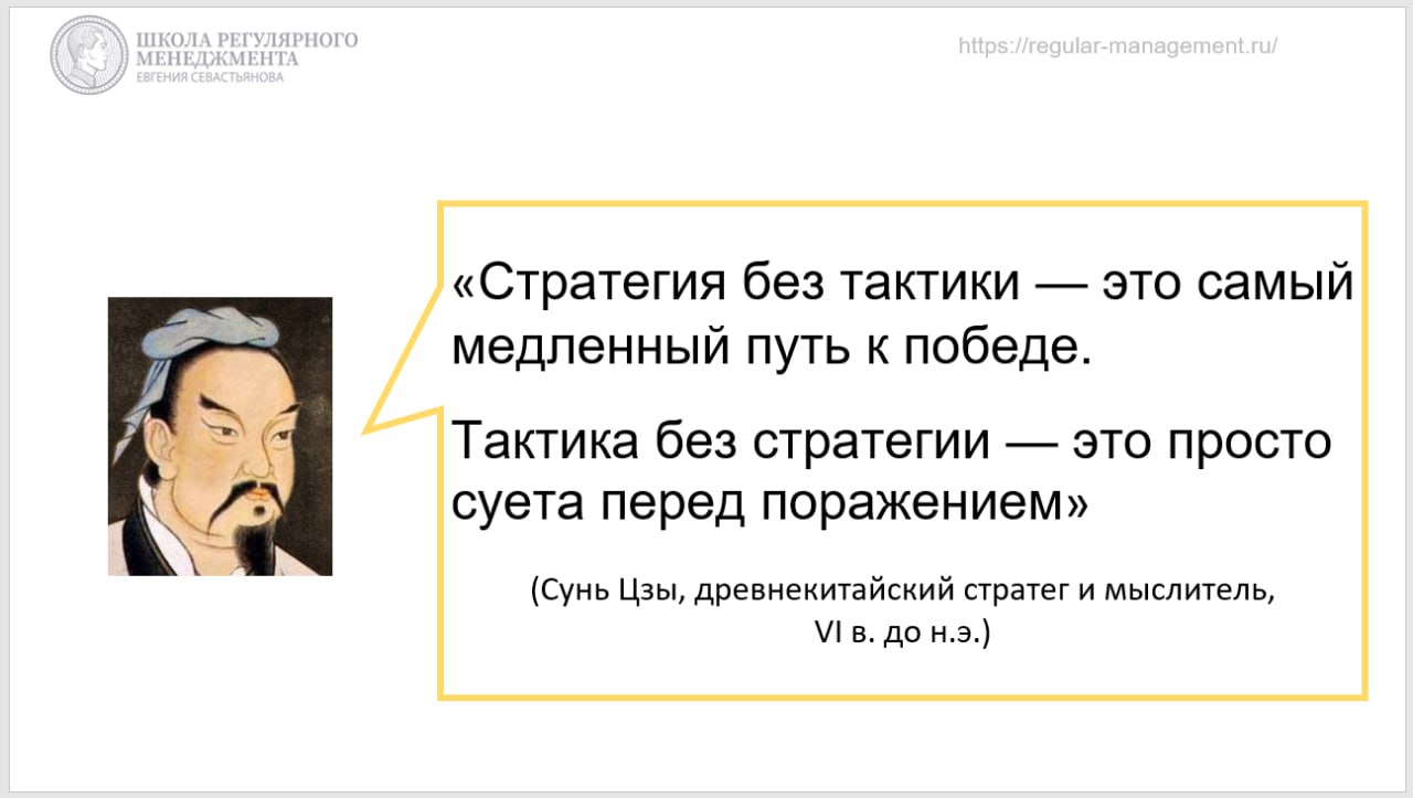 Ещё древнекитайский мыслитель Сунь-Цзы говорил: «Стратегия без тактики — это самый медленный путь к победе. Тактика без стратегии — это просто суета перед поражением».