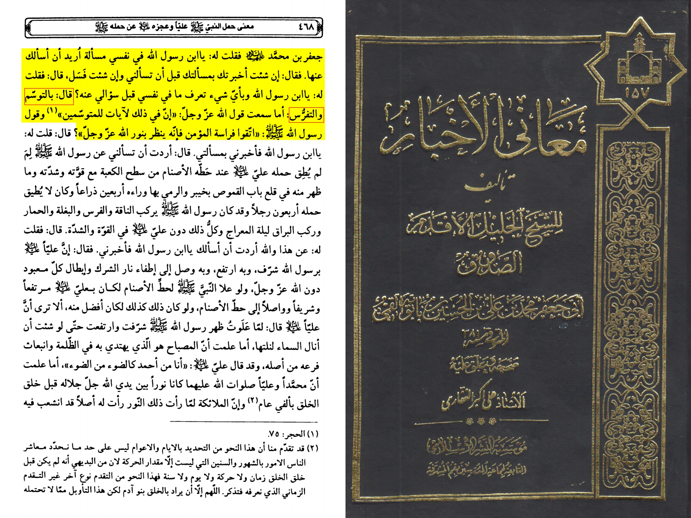عرض كرد : پس چیست وجه خبر دادن شما از آنچه در قلوب مردم است ؟ فرمودند آيا قول رسول خدا صلّى الله عليه و آله بتو نرسيده است كه از فراست مؤمن بپرهيزيد كه او بنور خدا نظر ميكند عرض كردم بلى فرمودند پس نيست مؤمنى مگر آنكه او را فراستى است كه به آن نظر ميكند بنور خدا بر مقدار ايمان خود و مبلغ استبصار و بينش و دانش خود همانا حق تعالى جمع كرده است از براى ما ائمه آنچه كه در جميع مؤمنین پراكنده كرده است و حق تعالى در كتاب محكم خود فرموده است إِنَّ فِي ذٰلِكَ لَآيٰاتٍ لِلْمُتَوَسِّمِينَ همانا در هلاك قوم لوط نشانها است از براى صاحبان فراست و اول متوسمين و صاحبان فراست رسول خدا صلّى الله عليه و آله است پس از آن امير المؤمنين عليه السّلام بعد از آن جناب است و بعد از آن امام حسن و امام حسين و ائمه از اولاد امام حسين صلوات الله علیهم است تا روز قيامت .