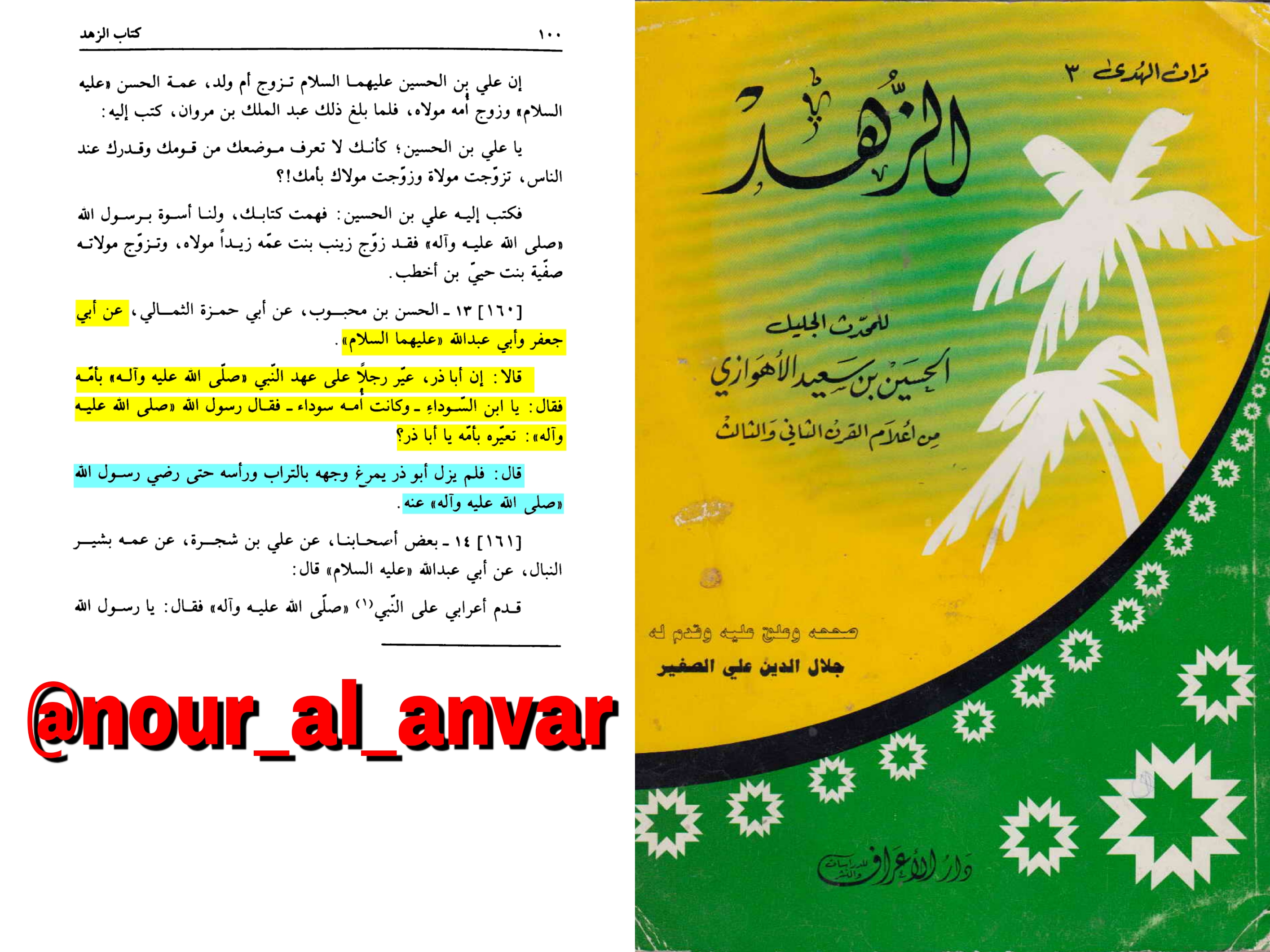 ✍ امام باقر و امام صادق صلوات الله علیهما فرمودند : إِنَّ أَبَا ذَر عَيَّرَ رَجُلا عَلَى عَهْدِ اَلنَّبِيّ صَلَّى اَللَّهُ عَلَيْهِ وَ آلِهِ بِأُمِّه فقال يَا اِبْنَ اَلسَّوْدَاء و كَانَتْ أُمُّه سَوْدَاءَ فقال رسول الله صَلَّى اَللَّهُ عَلَيْهِ وَ آلِهِ تُعَيِّرُهُ بِأُمِّهِ يَا أَبَا ذَرٍّ قال فَلَمْ يَزَلْ أَبُو ذَرٍّ يُمَرِّغُ وَجْهَهُ بِالتُّرَابِ وَ رَأْسَهُ حتی رَضِيَ رَسُولُ اَللَّهِ صلَّى اَللَّهُ عَلَيْهِ وَ آلِهِ عَنْهُ .