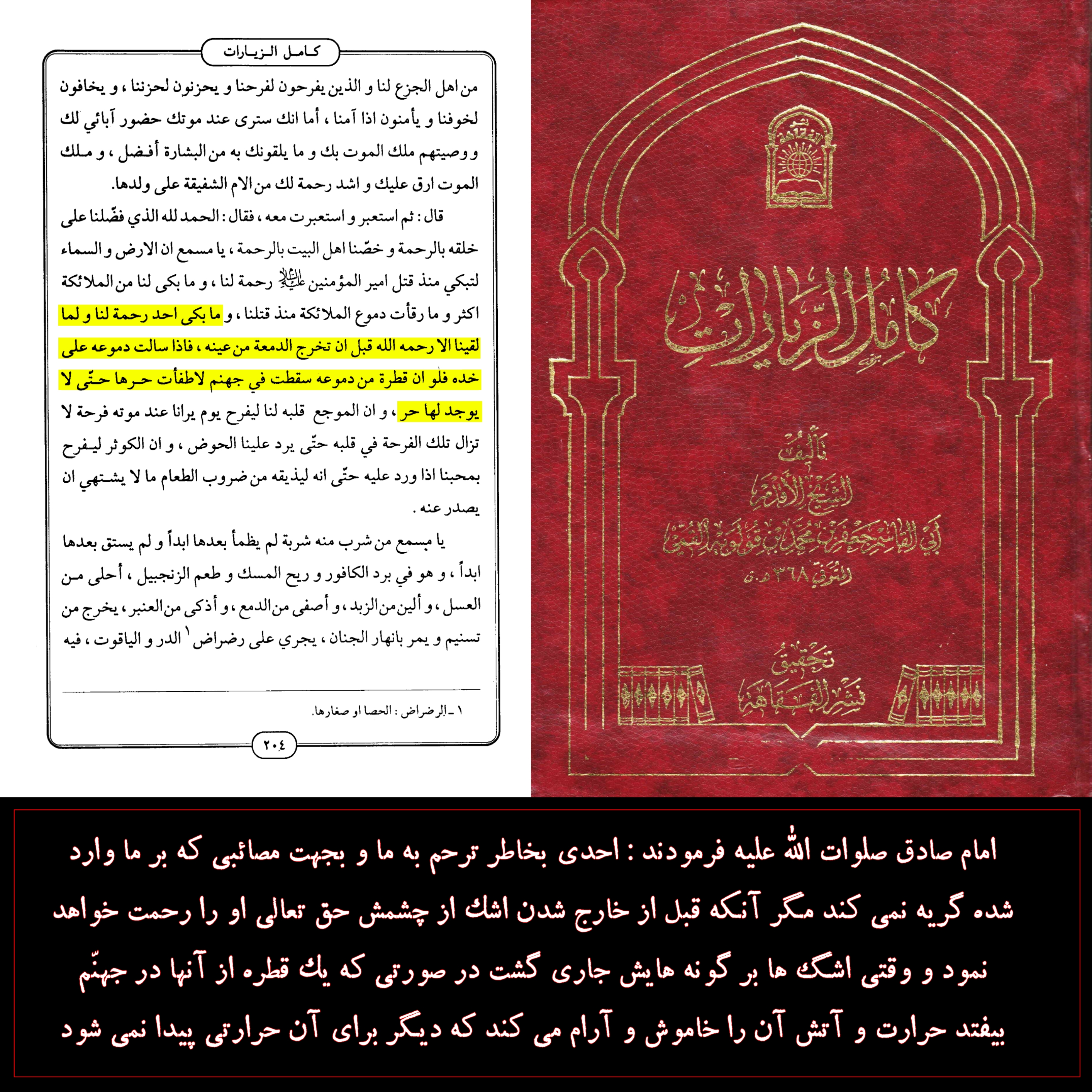 احدى بخاطر ترحم به ما و به جهت مصائبى كه بر ما وارد شده گريه نمى كند مگر آنكه قبل از خارج شدن اشک از چشمش الله او را رحمت خواهد نمود و وقتى اشک ها بر گونه هايش جارى گشت در صورتى كه يك قطره از آنها در جهنّم بيفتد حرارت و آتش آن را خاموش و آرام مى كند كه ديگر براى آن حرارتى پيدا نمى شود .