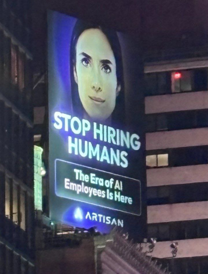 Плакаты Artisan с изображением искусственного интеллекта (ИИ) и слоганом «Хватит нанимать людей» являются частью провокационной кампании, запущенной в Сан-Франциско для продвижения «сотрудников ИИ» – виртуальных агентов, заменяющих человеческие задачи в продажах и обслуживании клиентов.