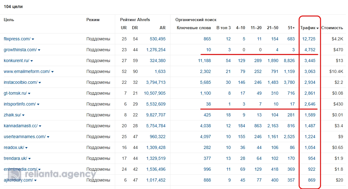Чтобы проверить наличие органики, воспользовались пакетной проверкой в ахрефсе. Сортируем по трафику и видим, что приемлемый органический трафик из Google есть лишь у первых 11 сайтов (из них 2 сомнительных).