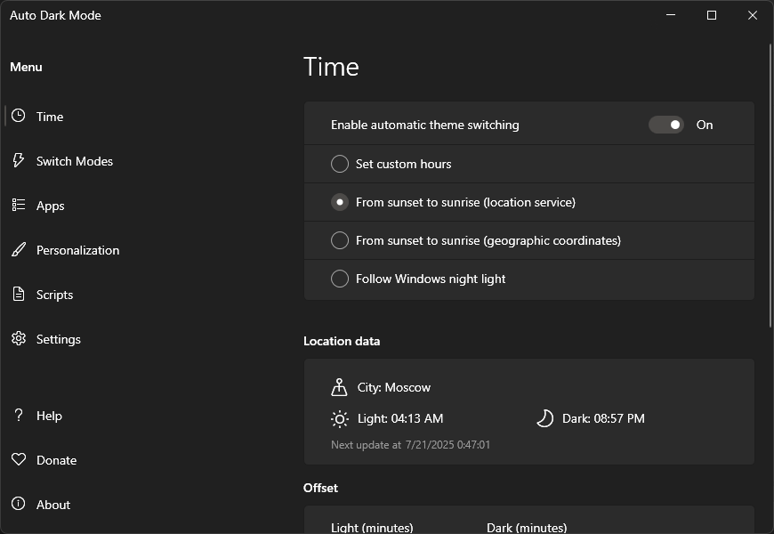 Кстати, у меня есть #классика блога: Как в Windows автоматически выполнять задачи на восходе и закате солнца. Навскидку это выглядит как Auto Dark Mode бедного человека :) Однако мои скрипты работают в Windows из коробки, а для их запуска не требуется переключать режим оформления Windows и программ.