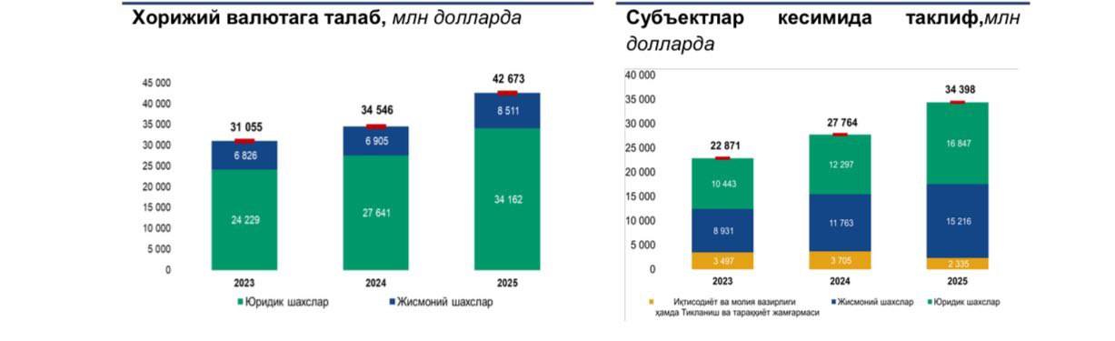 2025 йилнинг 9 ойида хорижий валюта таклифи хорижий валютага талабдан бироз тезроқ суръатда ошган. Бу ҳали олтин хариди билан боғланган стерилизация операцияларини ҳисобга олмаганда (9 ойда 9 899,8 млн.долларлик олтин экспорт қилинган, талаб ва таклиф фарқи эса 8 275 млн.долларни ташкил этган).
